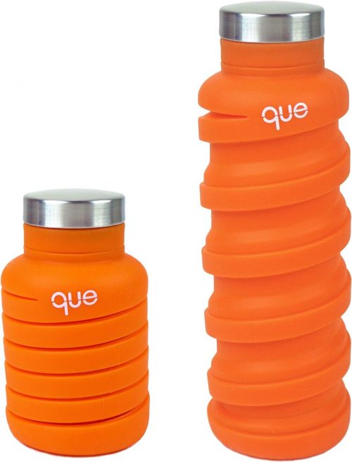 半分の大きさに折りたたんで持ち運べるマイボトル。漏れを防ぐ構造を採用しており、落下の衝撃にも耐える仕様で、アウトドアで使用することもできます。