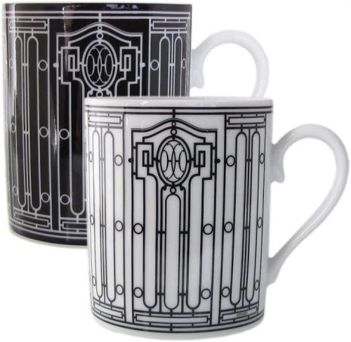 エレガントなデザインが目を引くマグカップのペアセットです。高級ブランドのエルメスが手がけた製品。パリのフォーブス24番地とセーヴル通りのエルメスブティックにあしらわれている「アール・デコ様式」の装飾金具を参考にしたデザインが魅力です。