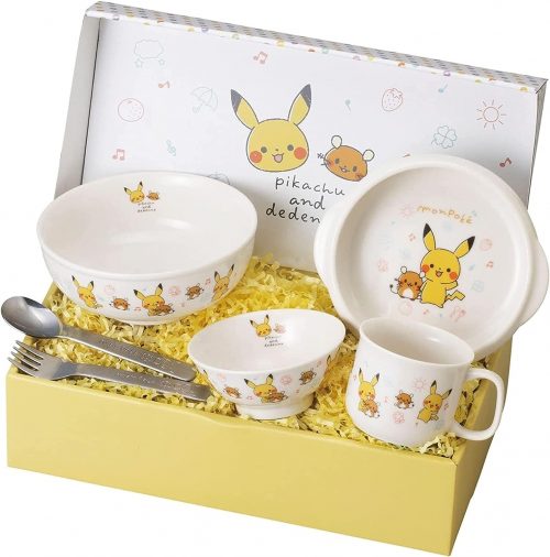 セットには、茶碗、マグ、ラーメン丼、使いやすいお皿、ステンレススプーン、ステンレスフォークの6つのアイテムが含まれています。ピカチュウとデデンネの可愛らしいイラストが描かれており、食事の時間を楽しく演出します。