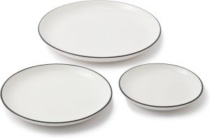 便利でおしゃれな食器セットです。色は柔らかいホワイトで、シンプルな無地のデザインに黒い縁取りがアクセントを添えています。洋食のハンバーグやパスタはもちろん、和食の煮物や焼き魚にもぴったりです。日常の食事におすすめのセットです。