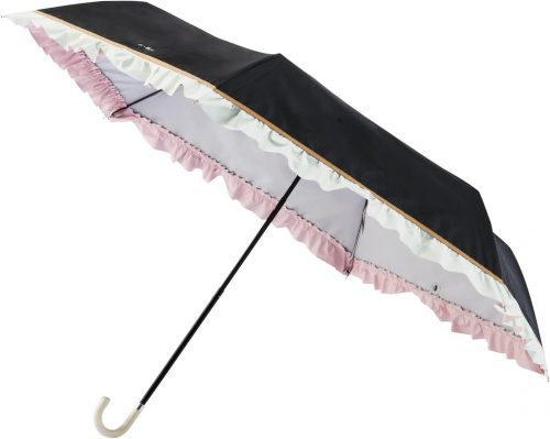 バイカラーのフリルがかわいい折りたたみ日傘です。内側のカラーラミネーションにより、顔まわりが明るく美しく見えるのが特徴です。ガーリーなデザインが好みの方にぴったりです。
